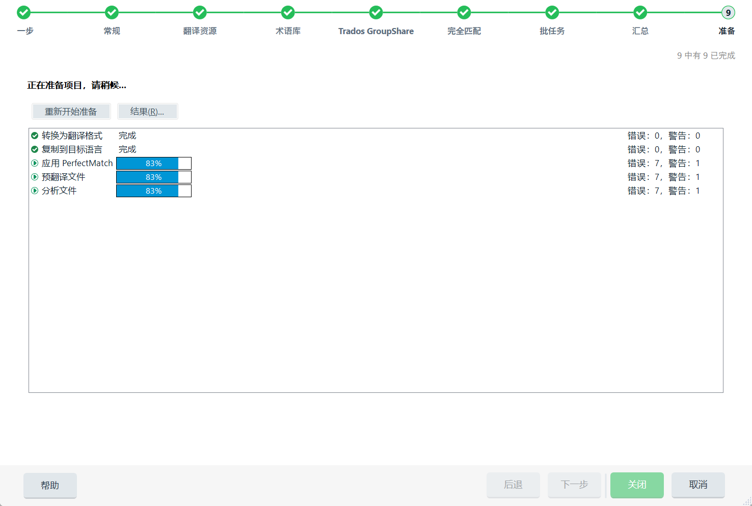 在后三个任务完成时若提示错误,可直接忽略错误,让项目创建完成。在项目创建成功后,再单独执行后面3个任务,包括预翻译、分析文件字数等。