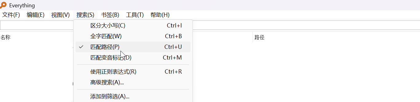 打开Everything,如下图所示,点选菜单栏上的搜索 – 匹配路径。